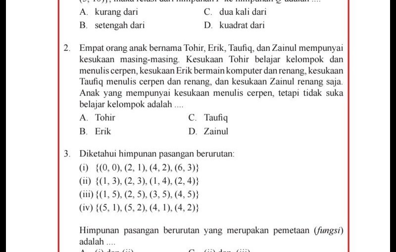 Dua suku berikutnya dari pola: Dua suku berikutnya dari pola: 50, 43, 37, 32, 27 e. Dibagi 4, bersisa 34, 8, . (2, 6), (3, 11), (5, .