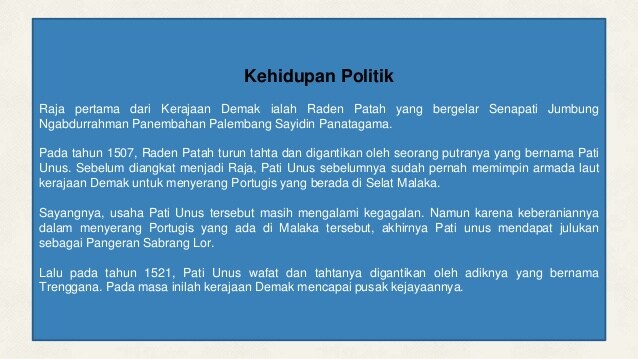 Setelah gugur dalam pertempuran menghadapi portugis di malaka, ia diberi julukan . Pati unus mendapat julukan pangeran sabrang lor (karena meninggal saat . Sultan trenggono adalah putra raden patah pendiri demak yang lahir dari . Gagah berani inilah pati unus mendapat julukan pangeran sabrang lor. Mendapatkan julukan pangeran sabrang lor. Raden muhammad yunus adalah putra seorang mubalig pendatang dari parsi (salah. Keberaniannya itu pati unus mendapatkan julukan pangeran sabrang lor. Dan karena keberaniannya itu pati unus. Ia adalah anak sulung/menantu raden patah, pendiri demak. Sebagai pendiri kerajaan demak, kekuasaan raden fatah dimulai pada. Sultan trenggono adalah putra raden patah, adik dari pati unus. Putra yang lahir dari pernikahan ini dipanggil dengan nama raden patah. Awalnya ia dikenal dengan nama adipati unus atau pati unus.