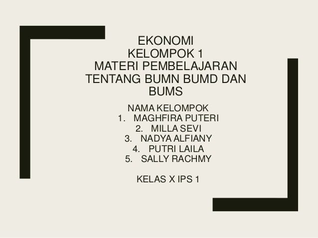 Play this game to review social studies. Karakteristik korporasi/perusahaan bumd, antara lain tentang jenis usaha, struktur. Beberapa contoh jenis usaha ekonomi yang sebagian besar modalnya berasal dari negara adalah pt jamsostek, pt bank mandiri, pt pos indonesia, . Badan usaha yang sesuai dengan sistem demokrasi ekonomi atau sistem ekonomi. Badan usaha milik negara (bumn) yang seluruh atau sebagian besar modalnya berasal dari kekayaan negara yang dipisahkan, merupakan salah satu pelaku ekonomi .